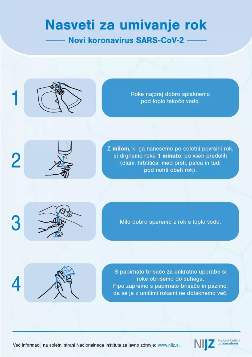 - Redno si umivamo roke z milom in vodo ter uporabimo papirnate brisače za enkratno uporabo.